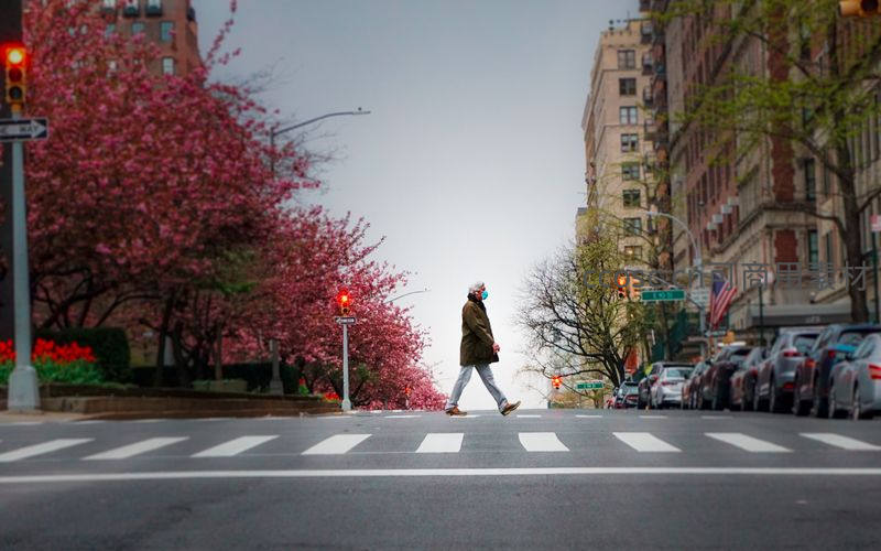 一位行人戴着口罩,在盛开的粉色樱花树下独自走过斑马线,两侧是整齐排列的汽车和古典建筑,营造出宁静又略带孤寂的城市春日氛围。