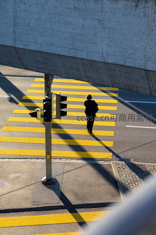 一人背对镜头,独自走过醒目的黄色斑马线,强烈的阳光在水泥墙和路面上投下锐利阴影,画面简洁却充满故事感与都市疏离感。