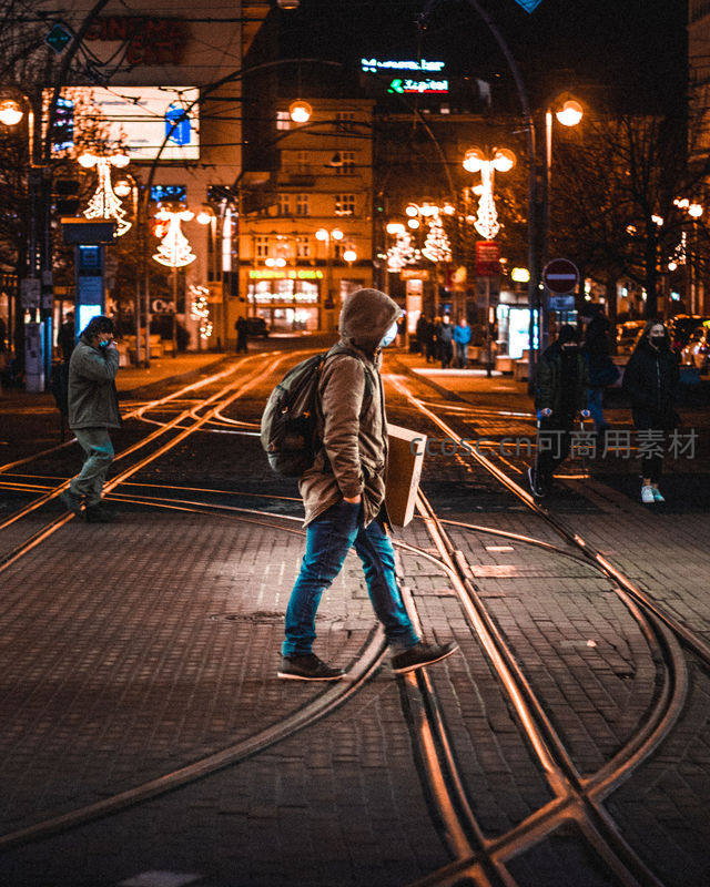 夜晚的城市街头,行人穿梭于闪烁的霓虹和温暖的街灯下,电车轨道蜿蜒穿过砖石路面,营造出静谧而充满生活气息的都市夜景。