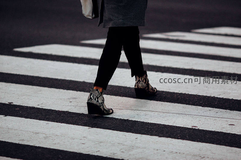 镜头聚焦于一双穿着蛇纹坡跟短靴的女性脚步,正优雅地跨过斑马线,简约背景突显鞋子设计,传递都市时尚气息。