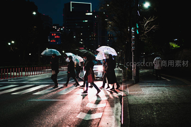 夜晚的城市街头,行人撑着透明雨伞在湿漉漉的斑马线上穿行,霓虹灯光映照在湿润路面上,营造出迷离而宁静的都市氛围。