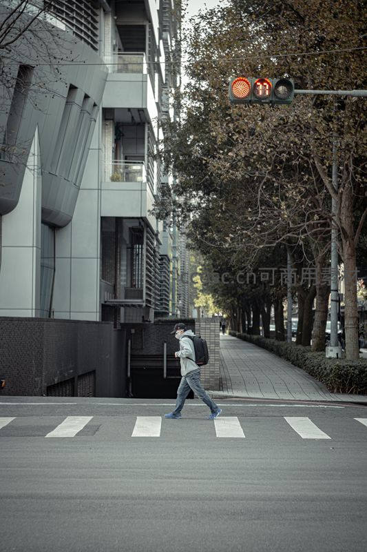 一位背着背包、戴着口罩的行人独自穿过现代风格建筑旁的街道,红灯亮起,两旁树木萧瑟,画面充满都市孤独感与静谧氛围。