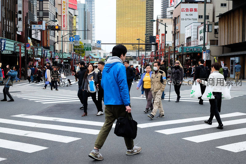 熙攘的都市十字路口,人们提着购物袋匆匆穿行于斑马线,背景是林立的高楼与日式招牌,展现现代都市生活的节奏与活力。