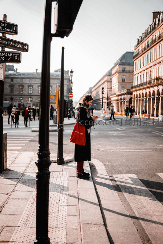 一位女士站在巴黎街头,手提红色购物袋,低头专注看手机。背景是古典欧式建筑与清晰路牌,阳光洒在石板路上,营造悠闲都市氛围。