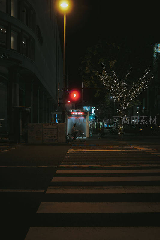 夜晚的城市十字路口,一盏暖黄路灯照亮斑马线,一人骑车静候红灯,旁有装饰彩灯的树木,整体画面宁静而富有生活气息。