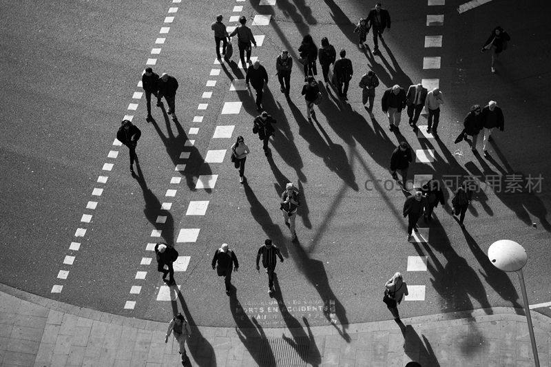 从高空俯瞰,行人穿梭于斑马线上,拉长的影子与地面线条交织成抽象图案,黑白对比强化了都市流动感与秩序之美。