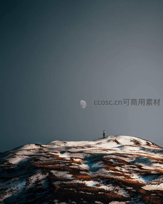 一人独立于白雪覆盖的山巅,遥望天空中的一轮弯月,画面空旷寂寥,传递出人与自然的渺小与壮美。