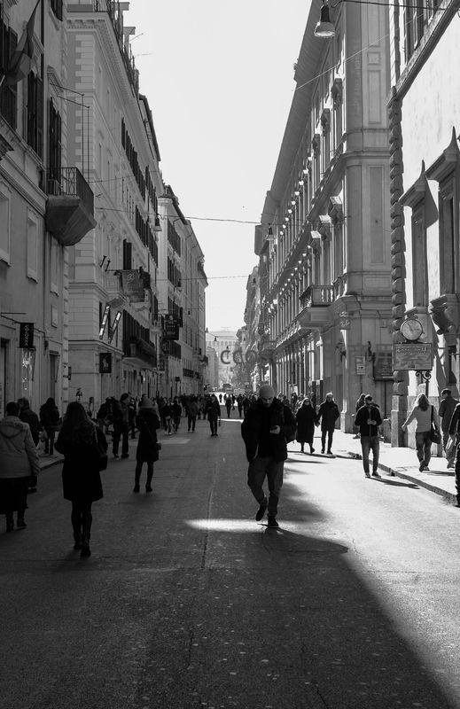 阳光洒在欧式街道上,行人穿梭于两旁古典建筑之间,黑白影像强化了空间纵深与市井生活的节奏感,充满纪实韵味。