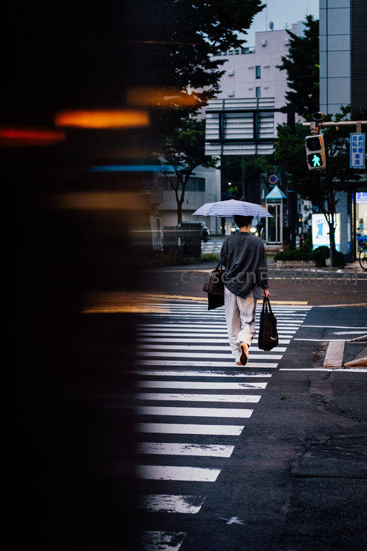 夜幕初降,撑伞行人穿越车流