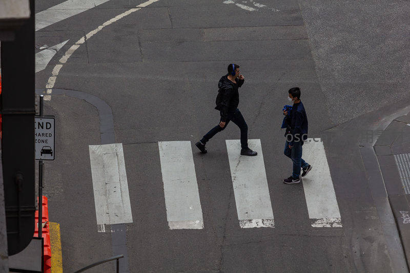 从高处俯瞰,两名行人正穿过城市街道的斑马线,一人在打电话,另一人手拿饮料,展现了现代都市人匆忙而真实的日常生活片段。