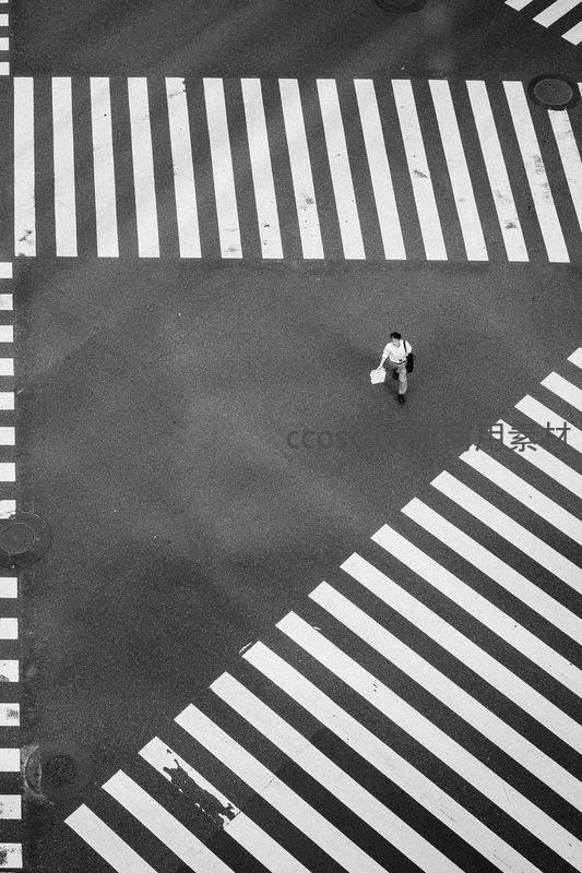 高角度黑白镜头下,一名行人手提物品穿行于巨大的白色斑马线之间,强烈的明暗对比与简洁构图突显现代城市的秩序与疏离感。
