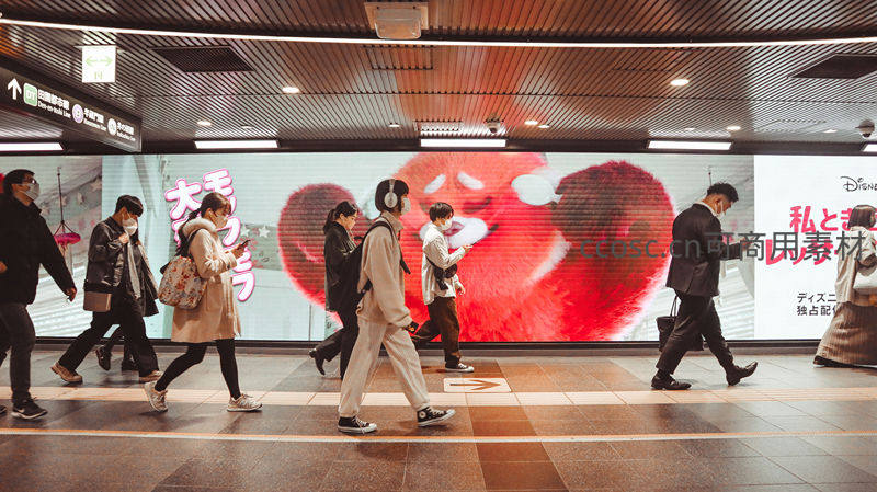在灯火通明的地铁站通道中,人们戴着口罩步履匆匆。巨大的电子屏幕上播放着鲜艳的迪士尼卡通广告,形成现代都市生活与流行文化碰撞的独特景象。