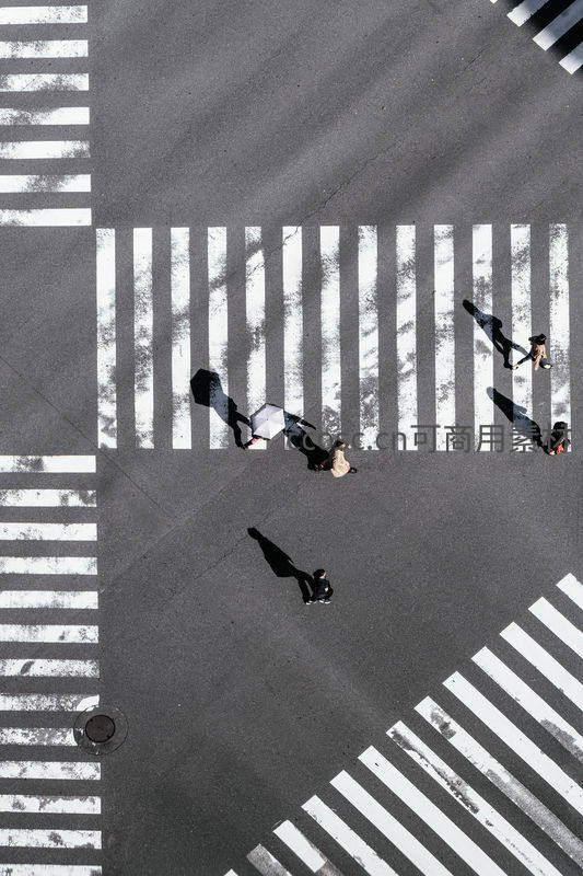 从高空垂直俯瞰,灰色的柏油路与白色的斑马线构成强烈的几何图案。几个行人的身影和他们被拉长的影子散落在路口,如同一幅充满秩序感的城市抽象画。