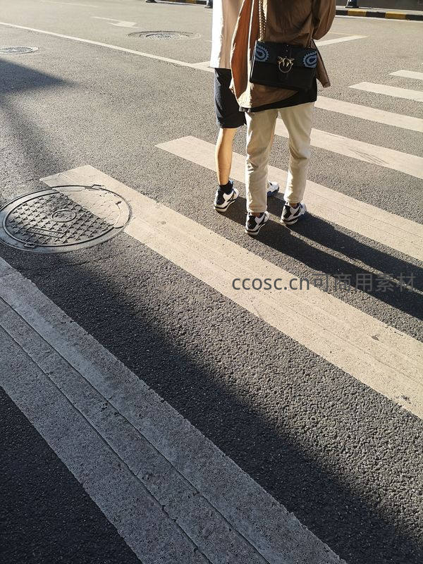 镜头聚焦于两位行人的腿部,他们并肩走在阳光斜照的斑马线上,脚下是清晰的影子和粗糙的沥青路面。一个黑色手提包和运动鞋的细节,勾勒出都市漫步的闲适姿态。