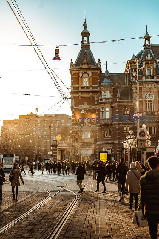 夕阳洒在古典欧式建筑上,行人漫步在铺满石砖的街道,电车轨道蜿蜒其间,构成一幅温暖而宁静的城市画卷。