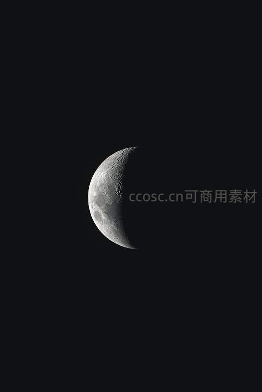 在纯粹的黑色背景中,一弯清晰的月牙悬浮其中,月球表面的环形山纹理纤毫毕现,尽显宇宙的静谧与神秘。