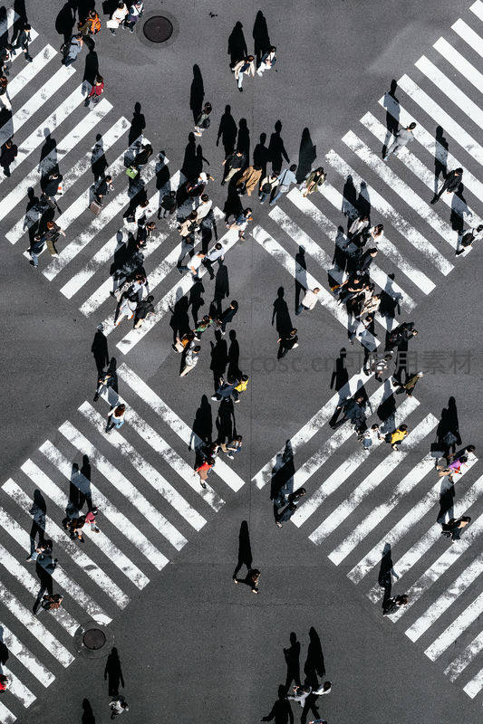 从高空俯瞰繁忙的十字路口,行人如蚂蚁般在斑马线上流动,黑白对比强烈,构成充满韵律感的几何图案与视觉冲击。