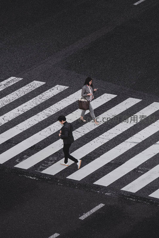 一对男女并肩走过略显斑驳的斑马线,一前一后,步伐轻快,展现了都市中平凡而温馨的日常瞬间。