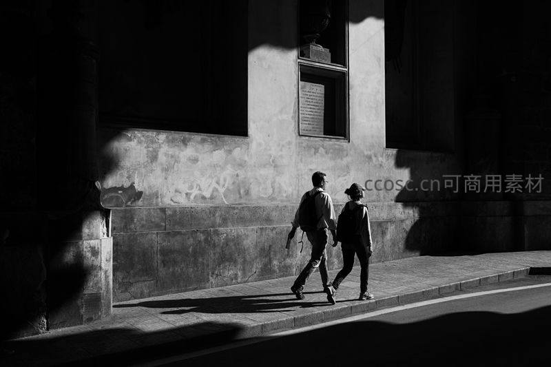 一对情侣在斑驳的墙影下并肩行走,强烈的明暗对比营造出电影般的质感,记录了城市角落里温馨而静谧的瞬间。