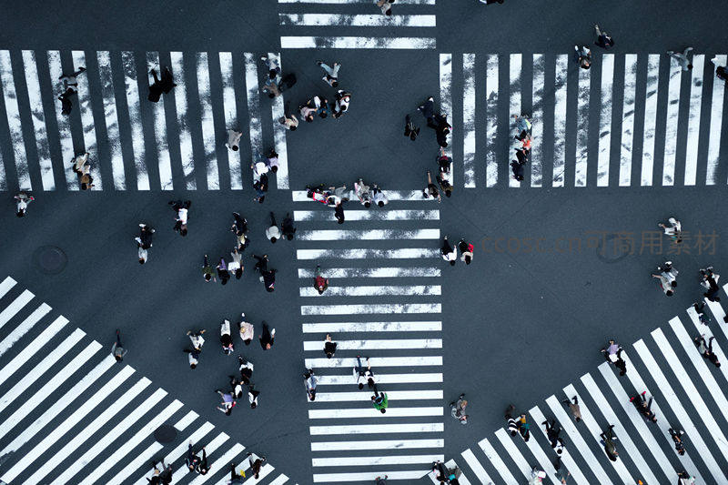 从高空俯瞰繁忙的十字路口,无数行人如棋子般穿梭于白色斑马线之间,展现现代都市高效运转与秩序井然的视觉奇观。