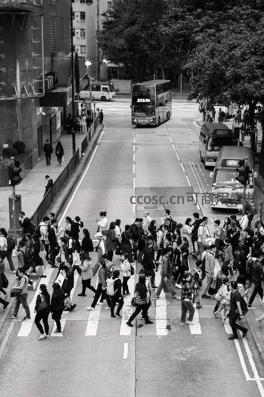 高角度拍摄的黑白街景,人群密集穿过斑马线,背景双层巴士与高楼林立,勾勒出香港等大都市快节奏生活的典型图景。