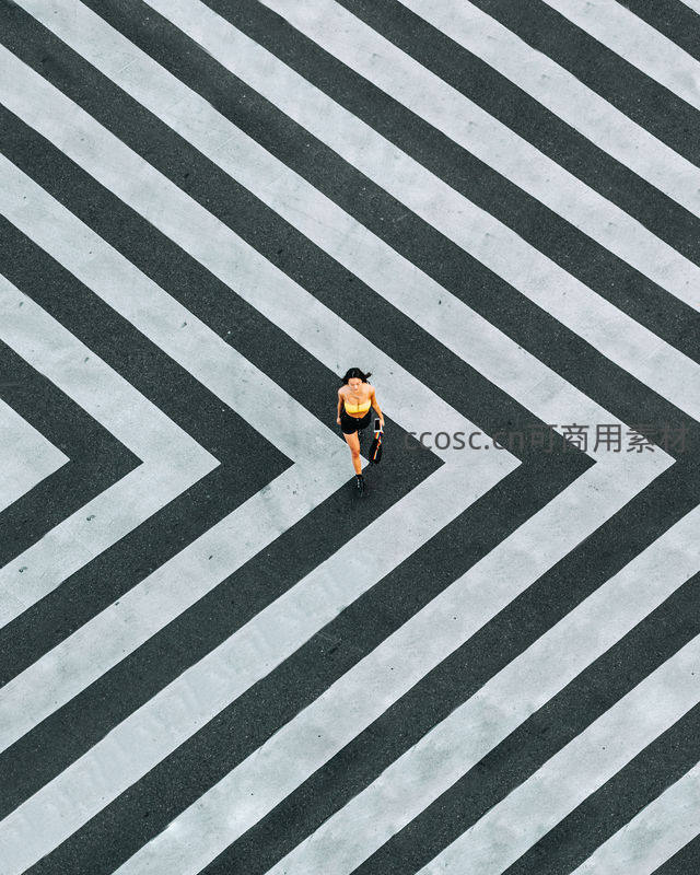 从高空俯瞰,一名行人独自穿行在巨大几何图案的斑马线上,强烈的线条感与渺小身影形成对比,营造出都市中的孤独与秩序之美。