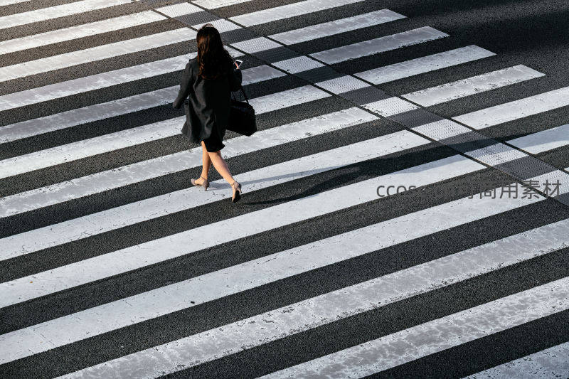 从高空俯瞰,一位身着黑衣的女性独自走过宽阔的斑马线,强烈的明暗对比和几何线条,营造出一种现代都市中的疏离与静谧感。