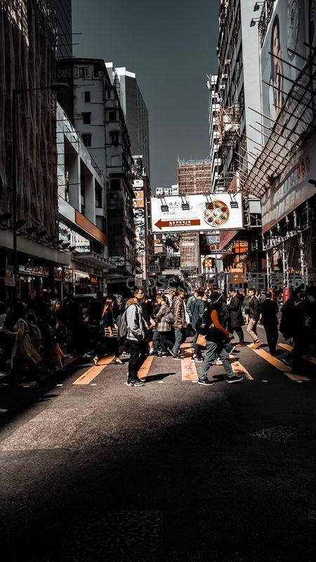 午后强烈的阳光斜射入香港狭窄街巷,形成鲜明明暗对比。行人密集地在斑马线上穿行,两侧高楼林立,广告牌悬空,展现了这座城市的紧凑与动感节奏。