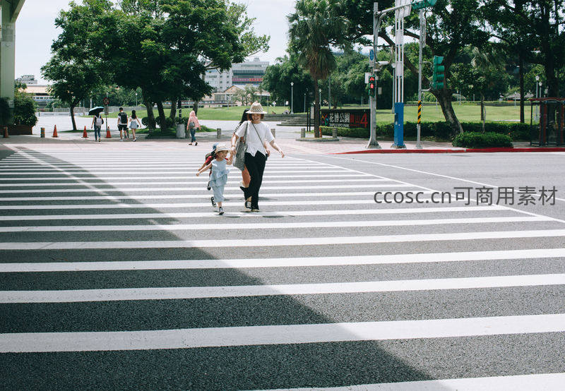 一位母亲牵着孩子的手,在宽阔的斑马线上欢快奔跑。背景是郁郁葱葱的公园和远处建筑,阳光明媚,画面充满亲情与活力,定格了城市中平凡而温暖的生活片段。