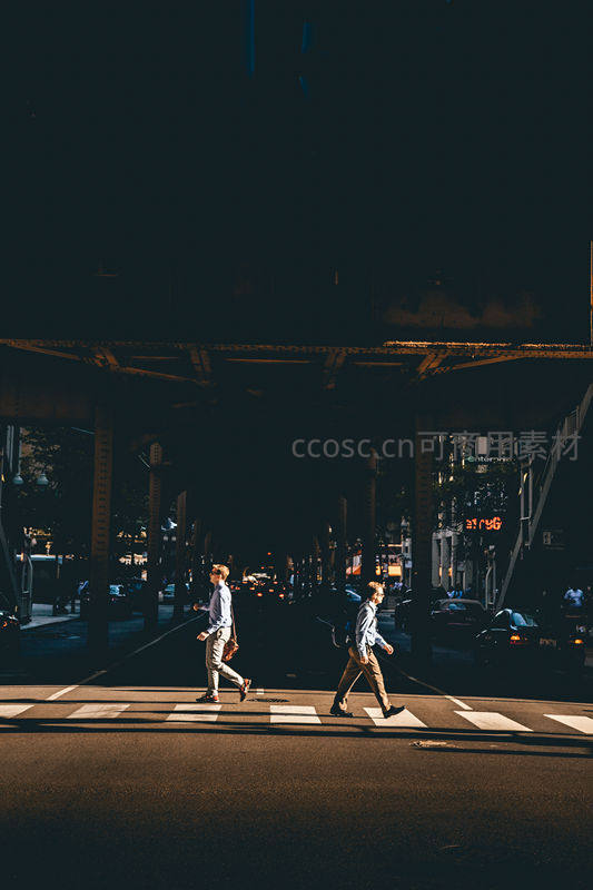 在黄昏的余晖中,两名男子并肩走在桥下的斑马线上,背景是城市的车流与霓虹,强烈的明暗对比勾勒出他们前行的剪影。