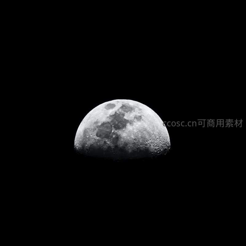 一轮清晰的半月孤独地悬浮在纯黑的背景中,其表面纹理历历在目,营造出一种静谧、深邃且富有禅意的氛围。