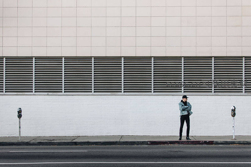 一个男子双臂交叉,静静伫立在纯白瓷砖墙前,背景是整齐的通风百叶窗。画面构图简洁,色调冷静,传达出一种现代都市中的疏离与沉思的情绪。