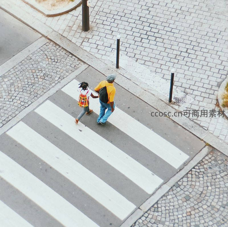 俯瞰斑马线上的温馨时刻,父女牵手漫步街头