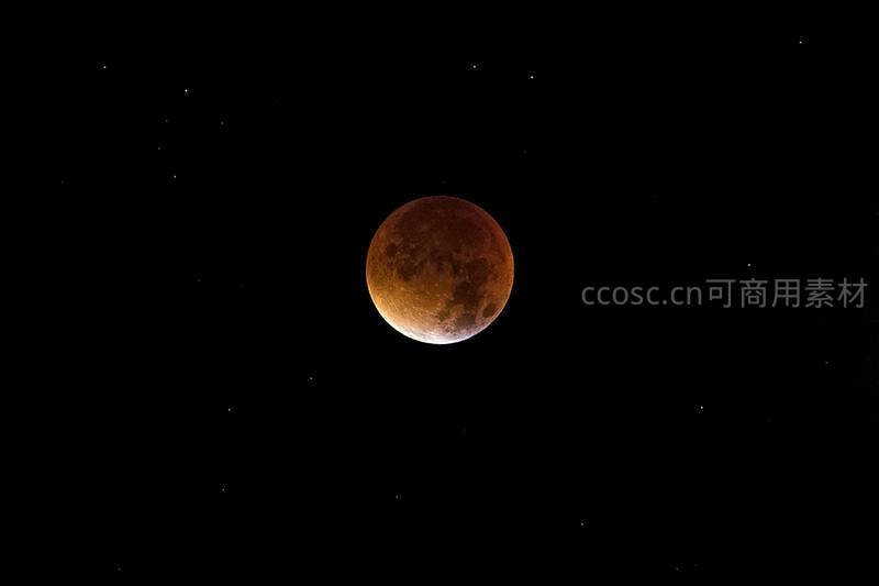 一轮被地球阴影染成深红色的血月,在漆黑的夜幕和点点繁星的映衬下,散发出神秘而壮丽的光芒。