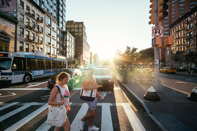 一对情侣手挽手走在纽约街头的斑马线上,背景是落日余晖洒满高楼大厦和行驶的公交车,充满温馨浪漫的生活气息。