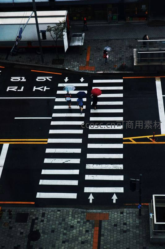 雨天俯瞰十字路口,三把伞下的静谧瞬间