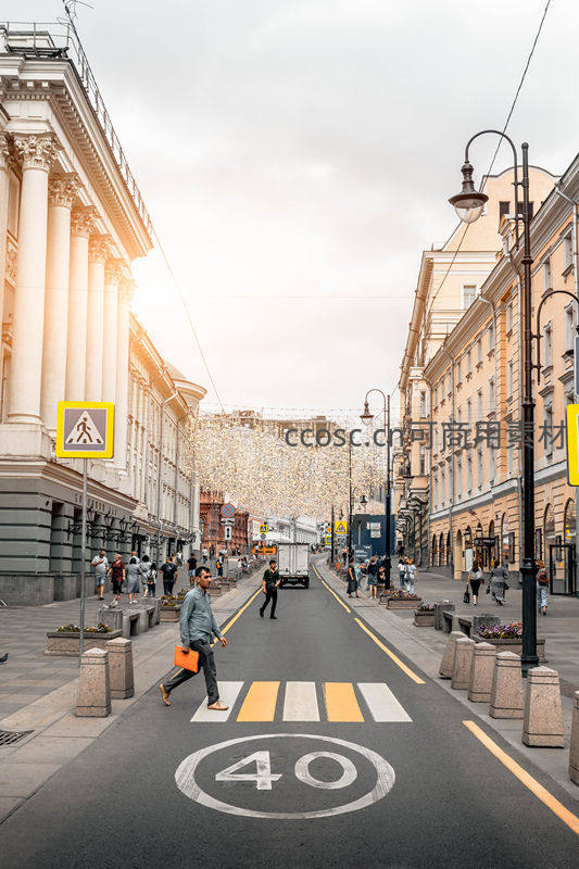 温暖的阳光斜照在古典欧式街道上,两旁是高大的柱廊式建筑,行人悠闲地走在斑马线上,远处悬挂着节日彩灯,充满生活气息与历史韵味。
