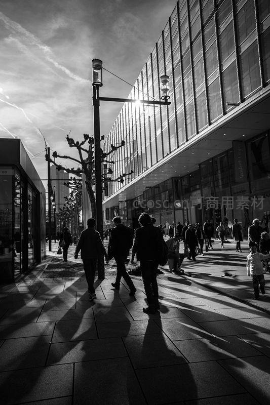 以黑白影像捕捉城市商业街的午后时光,阳光透过玻璃幕墙投下长长的行人剪影,现代建筑与古典路灯相映成趣,营造出静谧而富有艺术感的氛围。