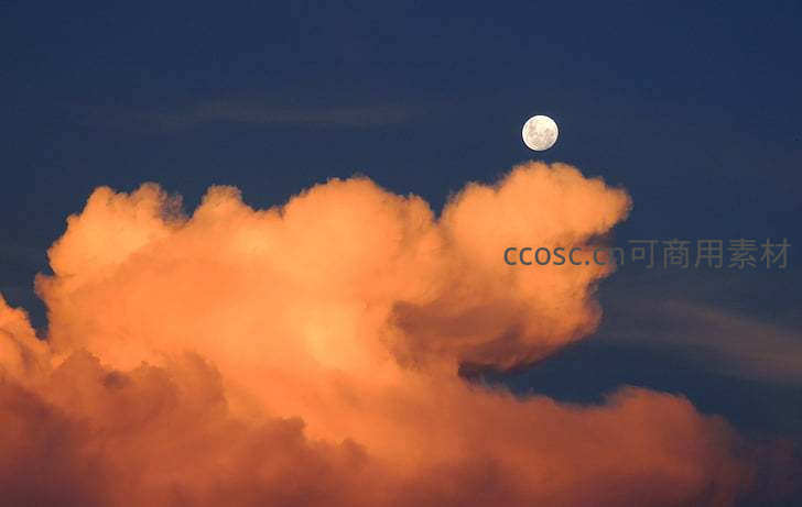 一轮明月高悬于深蓝夜空,被大片橙红色的云层温柔托举,构成一幅梦幻而宁静的自然画卷。
