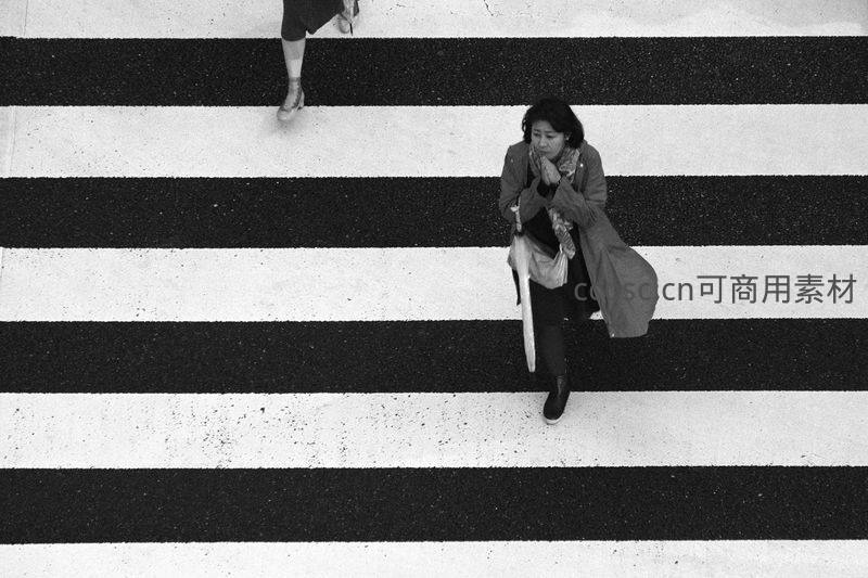 从高处俯瞰,黑白对比强烈的斑马线如琴键般铺展,一位低头行走的女性成为视觉焦点,简约构图传达出现代都市人的疏离与匆忙节奏。