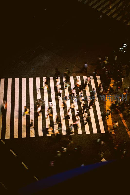 高角度俯瞰夜晚繁忙的十字路口,斑马线上人潮涌动,车灯与街灯交织成流动的光影,展现都市不夜城的活力与节奏。