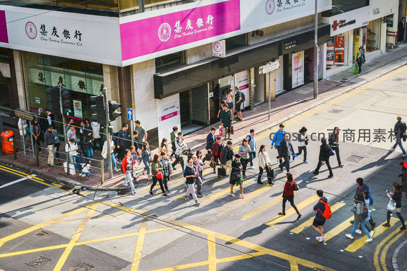 阳光明媚的城市街角,众多行人正穿过斑马线,背景是集友银行等现代商铺,展现了都市生活的繁忙与秩序。