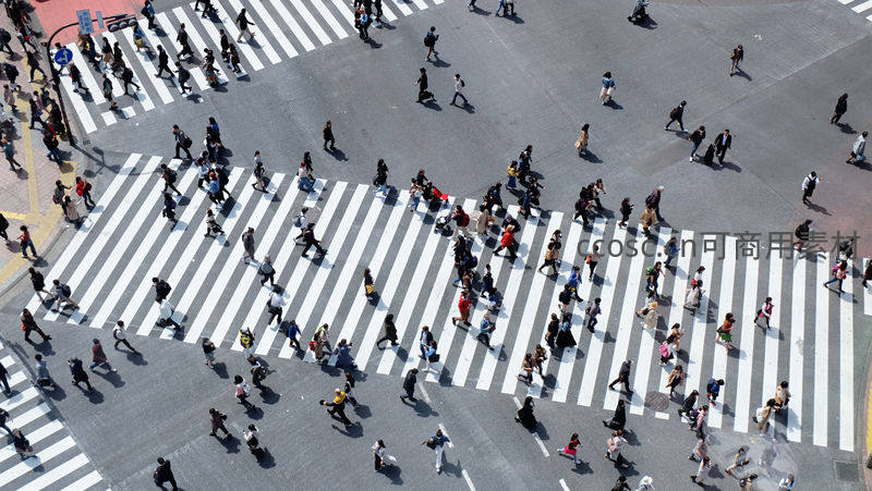 从高空俯瞰,密集的人群如潮水般涌过交错的斑马线,形成壮观的几何图案与动态韵律,体现现代城市规划的精密与活力。