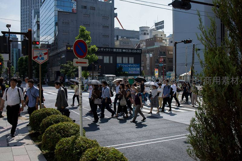 众多行人撑着伞在十字路口穿行,背景是现代化高楼和清晰的路牌标识,展现了都市繁忙有序的日常景象。