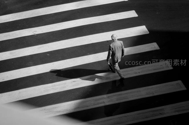 高角度黑白镜头捕捉一位行人独自走过斑马线,强烈的明暗对比凸显其孤独感与都市节奏。