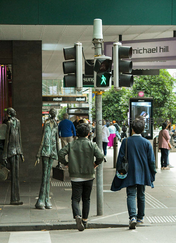 两位行人背对镜头走向绿灯,身旁是栩栩如生的青铜人像雕塑,现代都市中艺术与生活交融的瞬间。