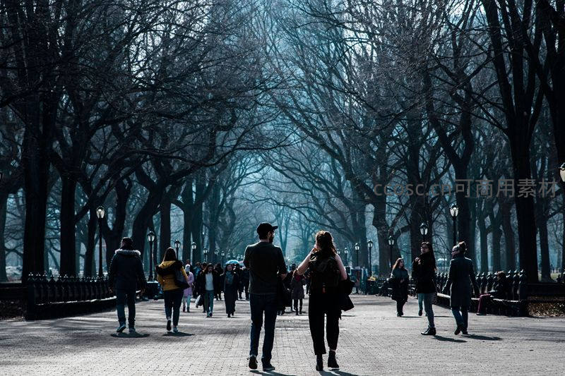 冬日公园林荫道上漫步的人群