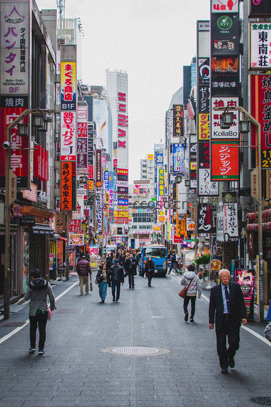 狭窄的街道两侧布满色彩斑斓的日文霓虹招牌,行人熙攘穿行其间,充满活力的商业氛围和独特的东方城市风情扑面而来。