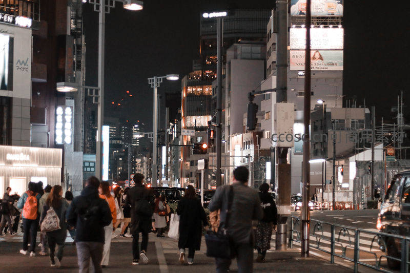 夜幕降临,城市街道被高楼与广告牌的暖光点亮,行人在光影交错中匆匆前行,展现出都市夜晚特有的喧嚣与流动的生命力。