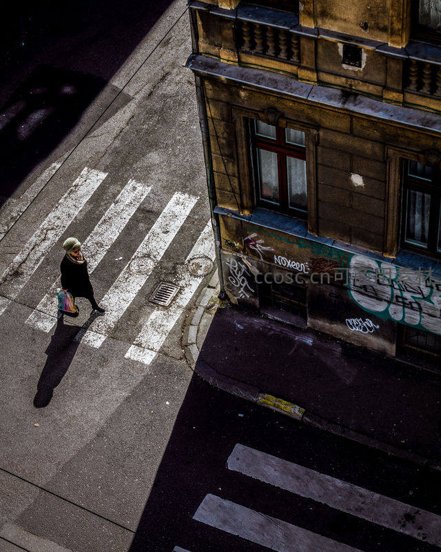 从高处俯瞰,一位行人正穿过斑马线,身旁是布满涂鸦的旧式建筑墙面,强烈的光影对比突显了城市中孤独而真实的瞬间。